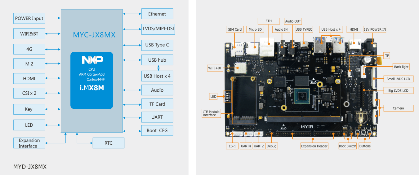MYD-C8MMX开发板提供LVDS显示(单路/双路)、MIPI-DSI信号引出、MIPI-CSI摄像头接口、支持音频输入输出、千兆网、多路USB、多串口、WIFI及蓝牙模块等丰富的接口