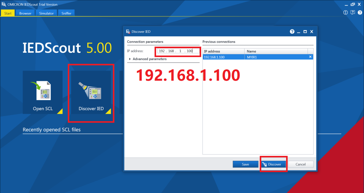 1. 点击IECScout(需用户自行下载)主界面下面的 Discover IED 按钮,然后输入输入服务端的IP地址 192.168.1.100 ,输入完成后点击 Discover 按钮。