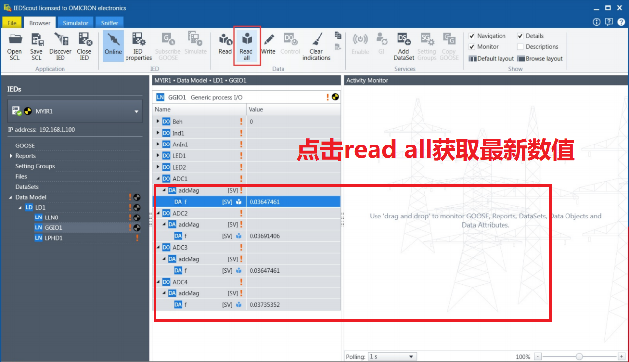 2.在WEB页面IEC61850应用中点击ADC下面的更新按键,此时WEB页面中ADC的值更新到了最新值,同时ADC的值也写入到了IEC Server中,此时需 要在IECScout软件中点击菜单栏的Read all按钮来更新通用I/O控制界面中ADC的值。