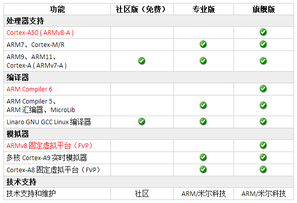 DS-5旗舰版最突出的特点是支持Cortex-A53/A57内核,即ARMv8内核架构,并且首次引入了ARM compiler 6版本编译器。同时,在DS-5旗舰版中,还可以使用现成的ARMv8固定虚拟平台(模拟器),DS-5旗舰版与社区版和专业版的主要区别如下。